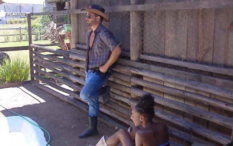 O casal dividiu o trabalho do trato dos animais e aproveitou para ficar de chamego.